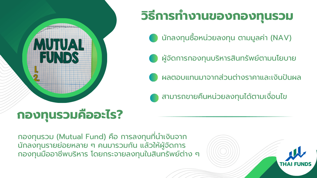- กองทุนรวม (Mutual Fund) คือ การลงทุนที่นำเงินจากนักลงทุนรายย่อยหลาย ๆ คนมารวมกัน แล้วให้ผู้จัดการกองทุนมืออาชีพบริหาร โดยกระจายลงทุนในสินทรัพย์ต่าง ๆ
