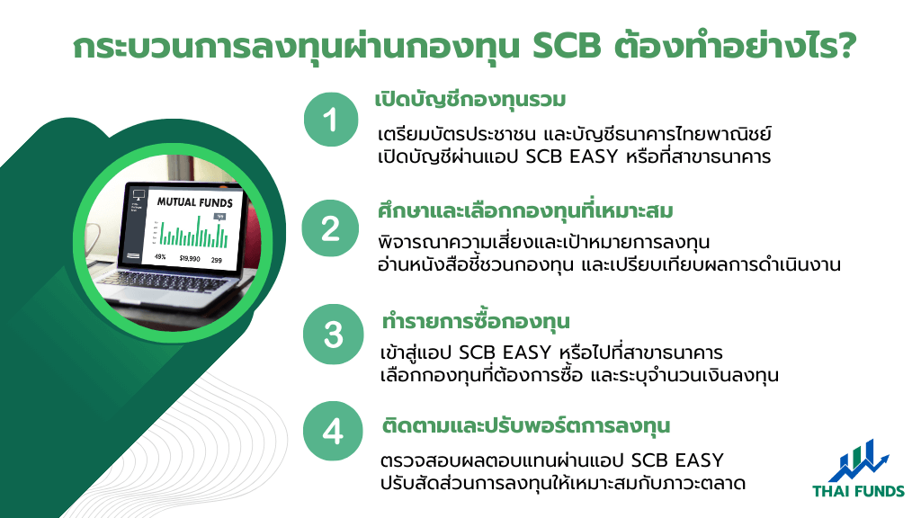- การลงทุนผ่านกองทุนรวมไทยพาณิชย์ เริ่มต้นต้องเปิดบัญชีกองทุน พิจารณาเลือกกองทุนที่ตรงกับเป้าหมาย ทำรายการซื้อกองทุนรวม ติดตามและปรับพอร์ตการลงทุน